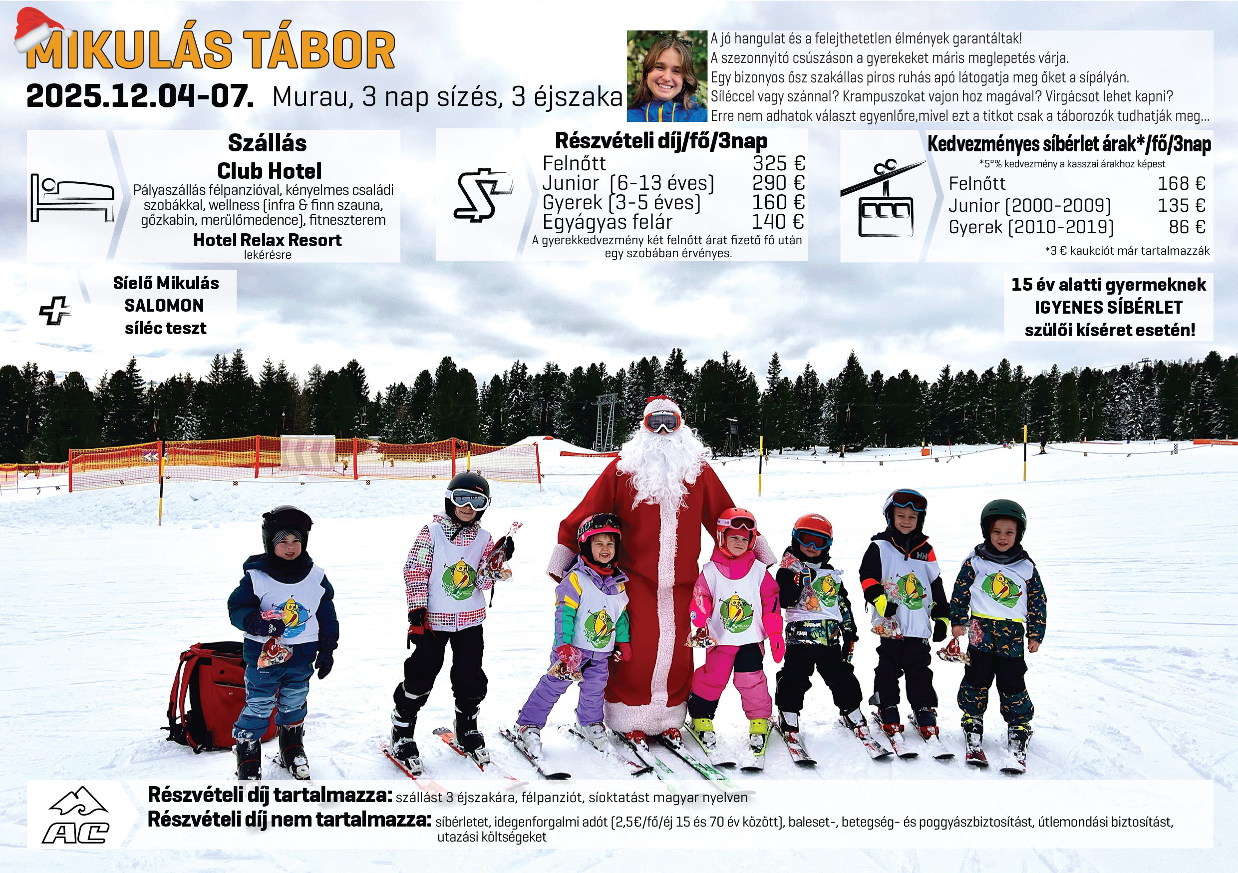 díj nem tartalmazza: utazást, idegenforgalmi adót, biztosítást, síbérletet